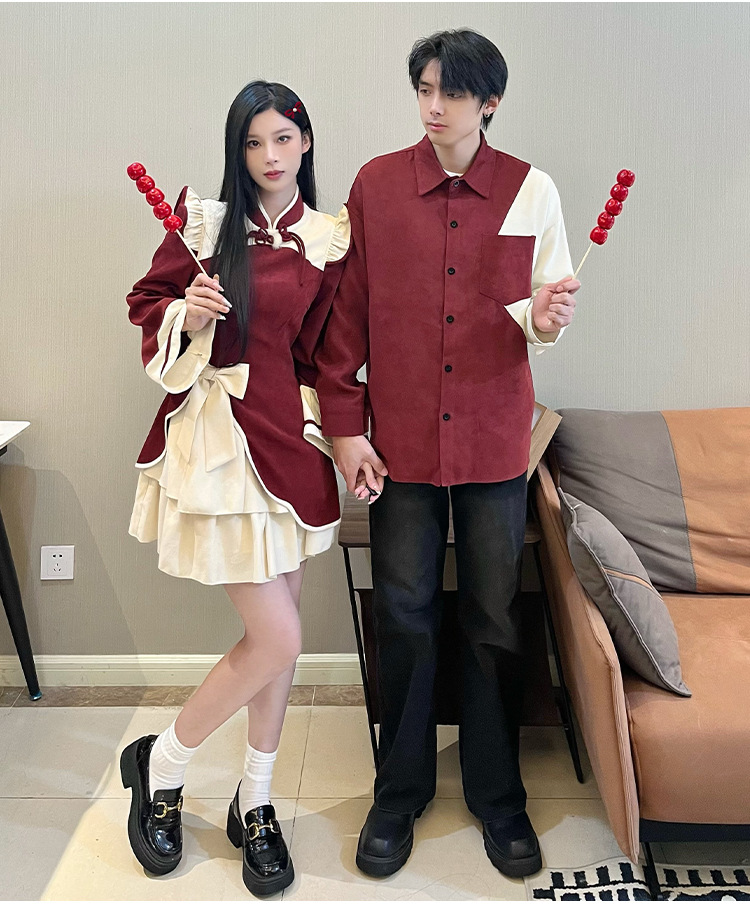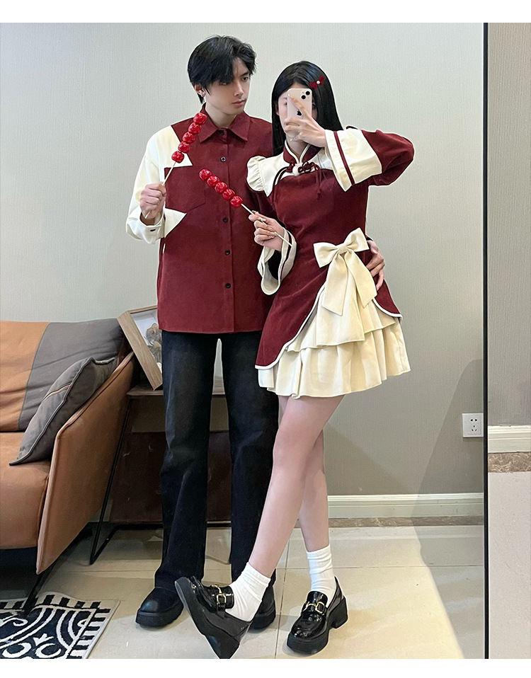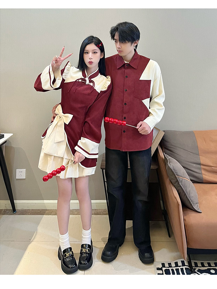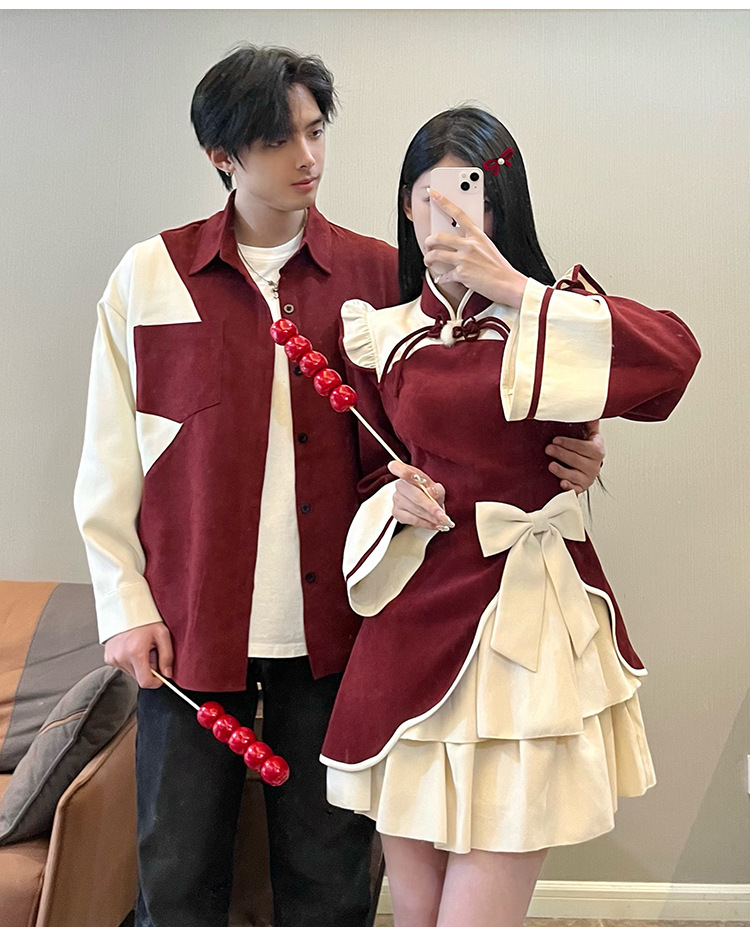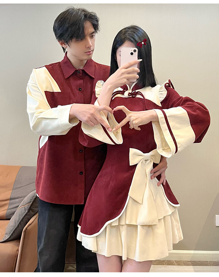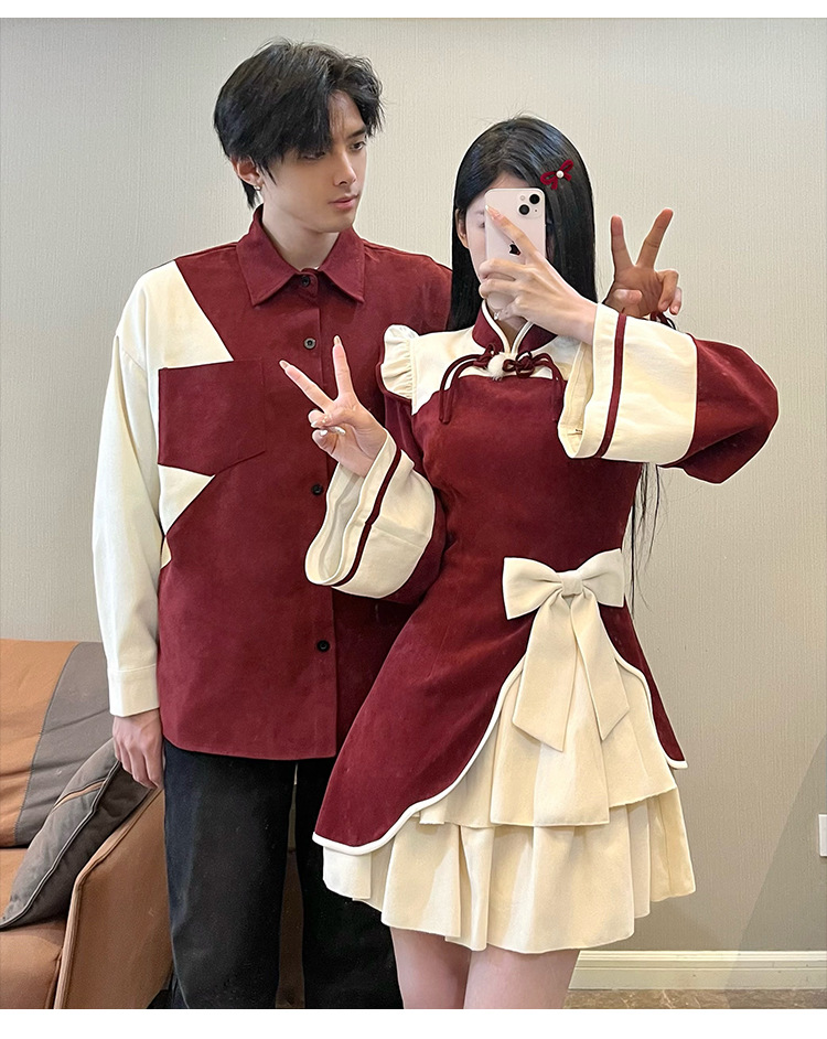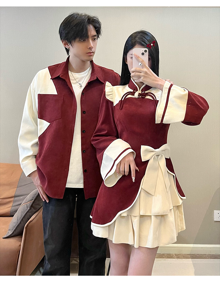Casual Chinese Style Couple Outfits Women's Festive Cheongsam Collar Dress Men's Shirt Brushed Outerwear 7-day unreasonable behavior